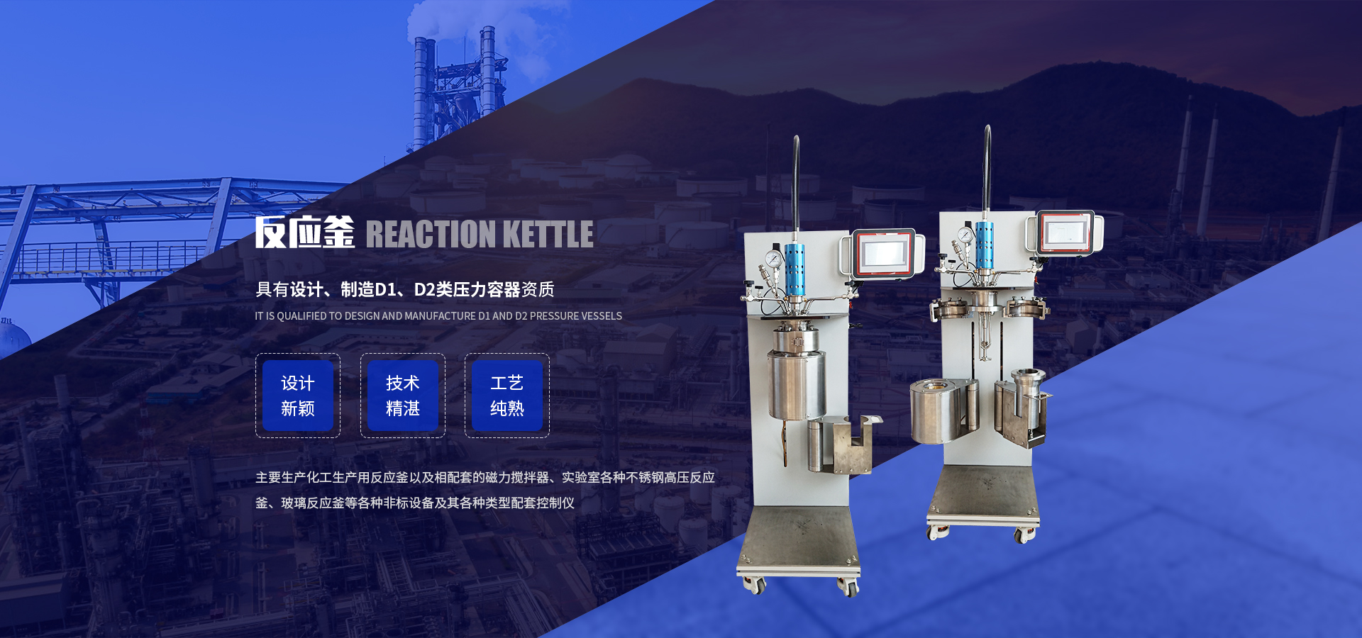 具有设计、制造D1、D2类压力容器资质,主要生产化工生产用反应釜、配套磁力搅拌器、实验室用:不锈钢高压反应釜、实验反应釜、玻璃反应釜、水热反应釜、均相反应器、连续反应装置、瓶聚槽反应装置、不锈钢反应釜等各种非标设备及各种类型配套控制仪。